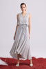 "V yaka, kolsuz, beli kuşaklı, fit kalıp, alt kısmı godeli kloş, astarlı, gizli fermuar kapamalı, puantiyeli elbise.
