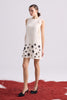 "Bisiklet yaka, omuzda fiyonk detaylı, kolsuz, etek ucunda siyah tüylü çiçek aplikeli, düz kesim, mini boy ekru elbise.