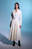 Ceket yaka, önden gizli çıtçıt kapamalı, uzun kollu, kemerli, yandan cep detaylı, önden yırtmaçlı, krep ekru uzun elbise.