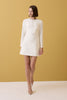 ÜRÜN AÇIKLAMA: Yuvarlak yaka, önü taş işlemeli düğme detaylı, arkadan gizli fermuar kapamalı, uzun kollu, fit kalıp, krep kumaş, ekru mini elbise.
