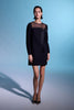 Yuvarlak yaka, yakası transparan, önü taşlı kurdale detaylı, uzun kollu, arkadan fermuar kapamalı, rahat kalıp, krep mini siyah elbise.