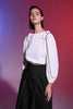 Yuvarlak yaka, omzu taş işlemeli ve pile detaylı, uzun balon kollu, arkadan birit düğme kapamalı, rahat kalıp, krem bluz.