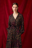 Ceket yaka, önden düğme kapamalı, uzun balon kollu, manşetli, kemerli, belden büzgülü tünel bağcıklı, oversize kalıp, krep kumaş, desenli midi boy elbise.