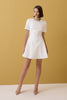 Yuvarlak yaka, yakası taş işlemeli ve kurdale detaylı, arkadan gizli fermuar kapamalı, kısa kollu, fit kalıp, ekru mini elbise.