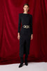 "ÜRÜN AÇIKLAMA: Arkadan gizli fermuar kapamalı, belden gold detay kemerli, vatkalı uzun kollu, eteği ön ve ortadan yırtmaçlı, düz dar kalıp, siyah midi boy elbise.